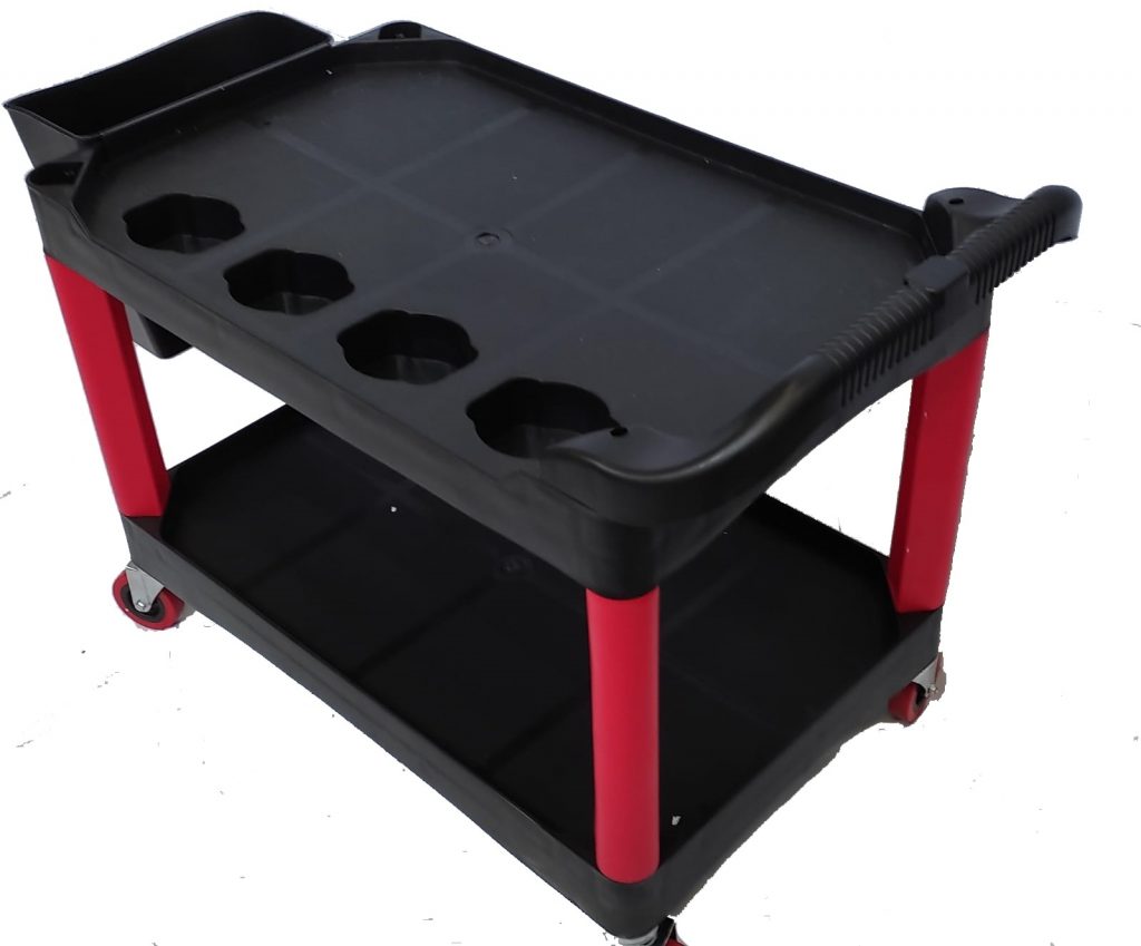 Excelente mesa de trabajo con ruedas, es baja 52 cm de altura, con dos estantes,uno de ellos con huecos para botellas que quedan mas estables, tambien a uno de sus lados tiene un balde que puede quitarse para limpieza, las ruedas le permiten desplazarse sin problemas.